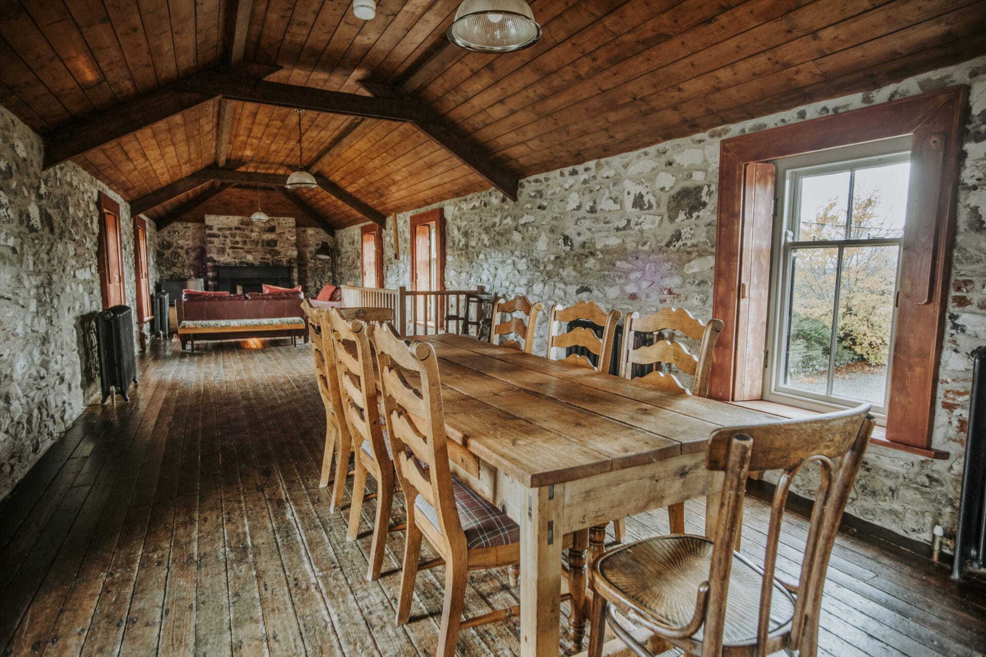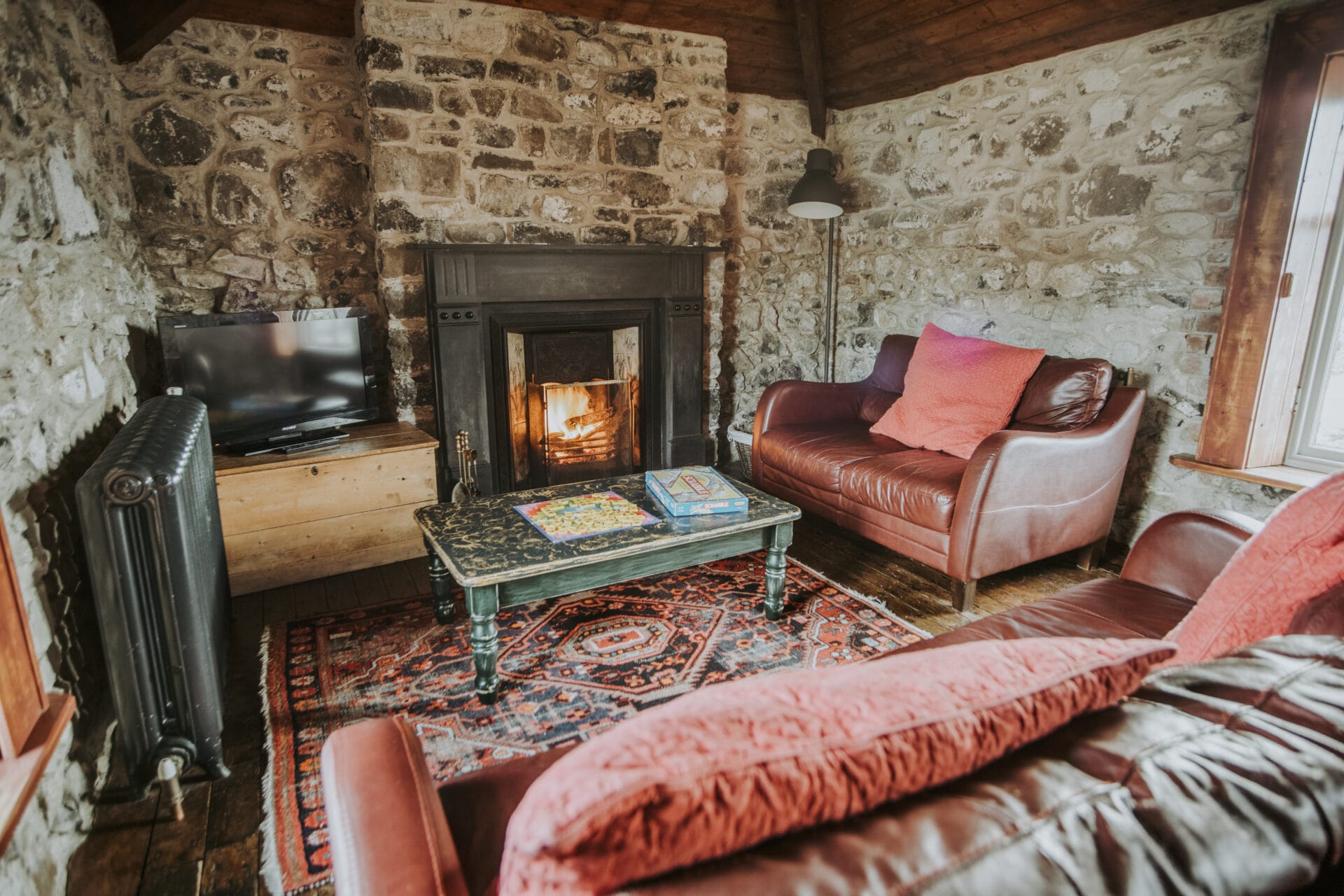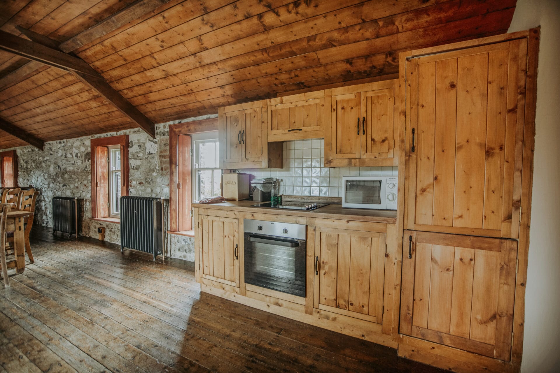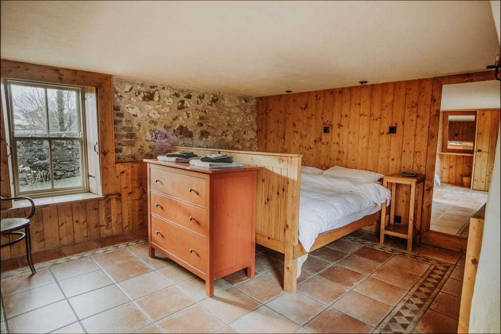 Dander up the steps and enter the kitchen, living and dining area of the Long Barn, with it’s cosy fire at one end and shuttered windows on both long walls. Walk downstairs to the two beautiful bedrooms, sleeping four people, were guests can request either a king size double or twin beds.